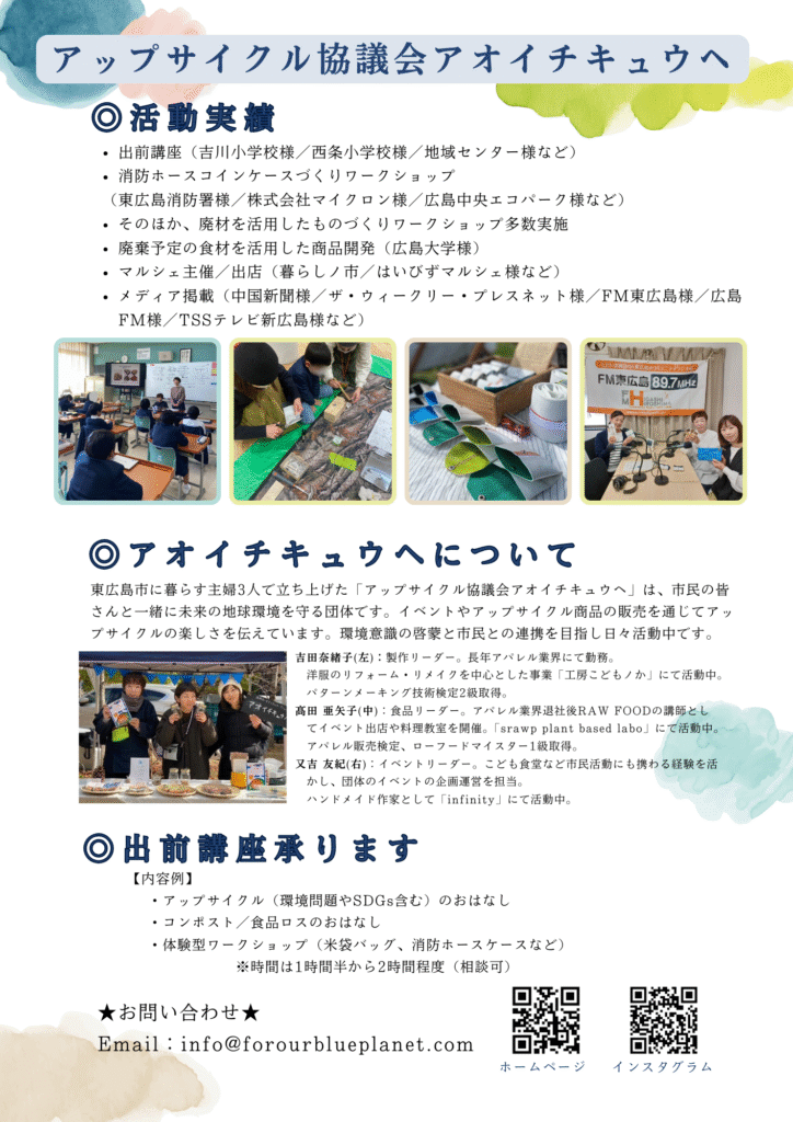 また、アオイチキュウヘでは、アップサイクルのおはなしや、コンポスト/食品ロスのおはなし、体験型ワークショップなどの内容の出前講座を承っております。